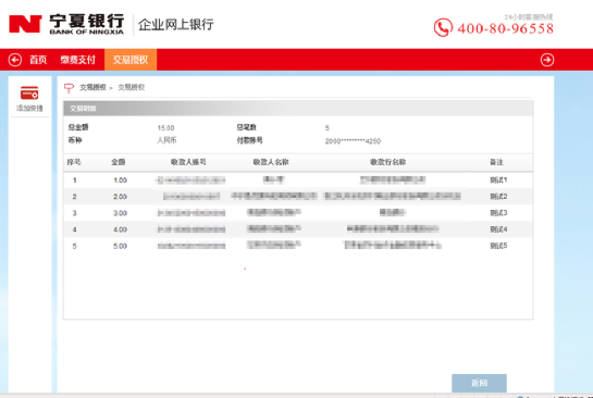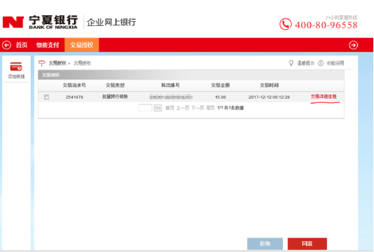 6、用企業(yè)審核員用戶登錄網銀系統(tǒng),進入菜單“交易授權->交易授權”,點擊交易類型為“批量轉賬”記錄的最后列“交易詳細信息”,查看交易詳細信息,然后點擊“返回”;