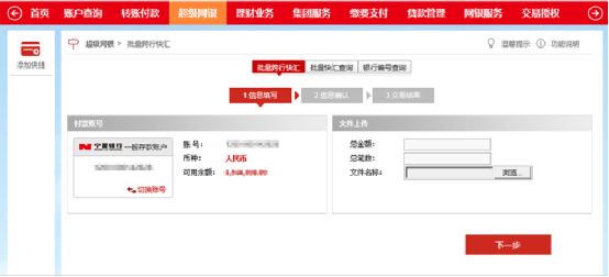 2、在錄入頁輸入轉賬的總金額以及總筆數(shù),點擊按鈕“瀏覽”,選擇要上傳的文件,點擊下一步;