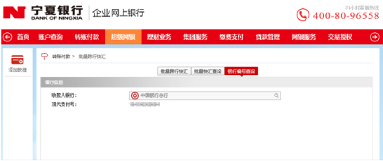 上傳文件內的現(xiàn)代支付號,可以在標簽頁“銀行編號查詢”里查到,在下圖頁面里首先選擇收款銀行,在下面彈出的網點下拉框里選中網點,最下方會自動彈出所選銀行的現(xiàn)代支付號。